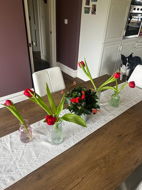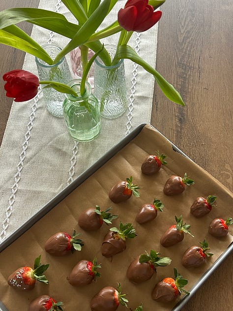 One tradition that I would love to implement is that on Valentine’s day, we make chocolate covered strawberries. Mainly because they’re simple and delicious. I was making them this year and got so emotional thinking about what next year might look like with my baby who will be about to turn a year old. I also made an effort to go out to my local florist and pick up some tulips and arrange them on our table. The bouquet cost me a pretty penny, but it was well worth the joy I felt each time I caught a glimpse of them on our dining table as I walked by.